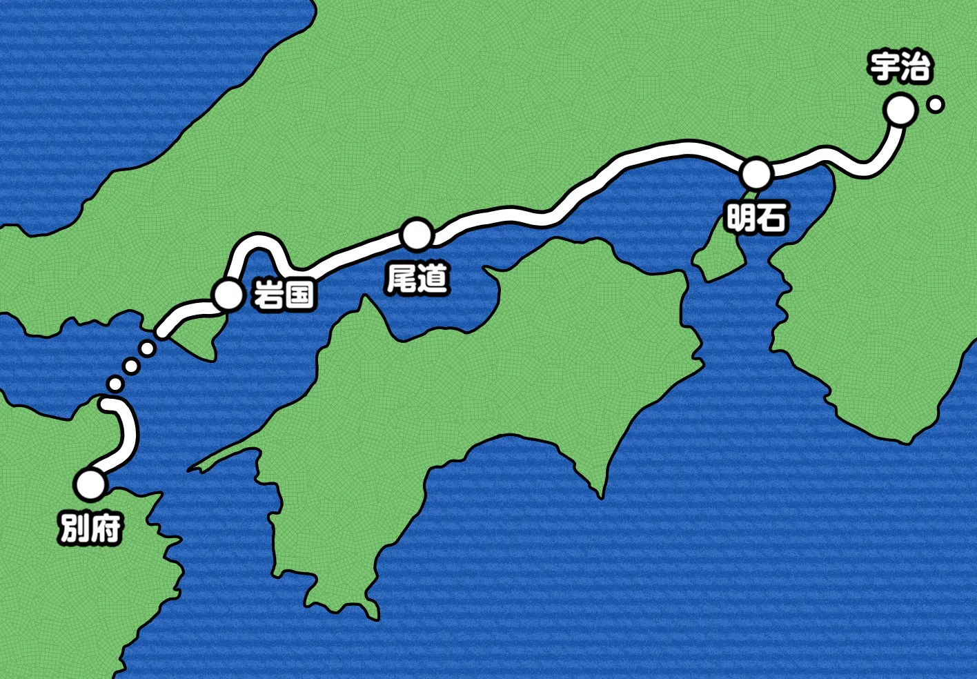 後半戦に突入した日本縦断は、中国地方を明石(あかし)・尾道(おのみち)・岩国(いわくに)泊の山陽ルートで順調に進みました。山口県の徳山(とくやま)と大分県の竹田津(たけたづ)を結ぶフェリーで九州上陸を果たし、別府温泉に宿泊して地獄めぐりを満喫。ゴールの鹿児島県がだいぶ近づいてきたので、この先はコイントスでの行き当たりばったり旅を終了してラストスパートに臨みます。目前に迫るゴールと順調な旅路に上機嫌な私でしたが、大分(ここ)で予期せぬトラブルが私を襲いました。