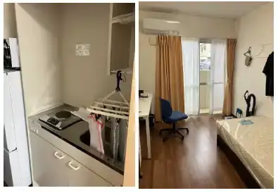 【部屋内】エアコン、ベッド(マットレス・寝具付き)、カーテン、ミニ冷蔵庫(2 ドア)、電子レンジ、一人用デスク&チェア、ハンガーラック、Wifi 完備 【共同】洗濯機、乾燥機、冷蔵庫、炊飯器、ガスコンロ、キッチン用品
